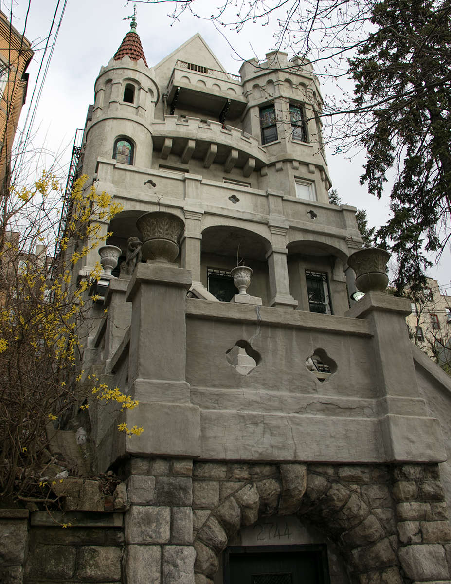 Description from the Bronx Survey: Perched high above Kingsbridge Terrace, this medieval fantasy boasts round and polygonal turrets, Tudor arches, crenellation, and projecting balconies. The house is not great architecture, but its romantic qualities make it a local landmark.