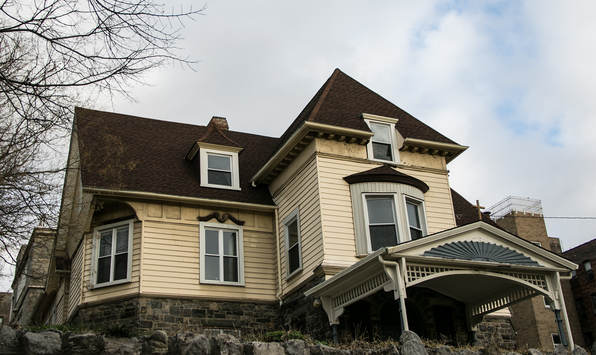 Description from the Bronx Survey: An impressive, asymmetrically massed mansion probably built c. 1900and currently used as a rectory for Our Lady of Angels R.C. Church. The house boasts such features as a ground floor clad in undressed fieldstone,an elaborately carved wooden porte cochere, and a rear circular towertopped by a bellcast roof. The upper story unfortunately has been marred by aluminum siding.